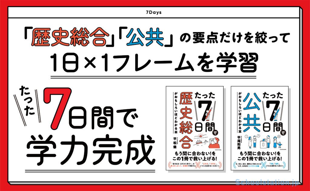 株式会社KADOKAWAが、共通テスト「歴史総合」「公共」で“捨て問”を作らない、最短1週間で最大25点数を積み上げる「直前対策」参考書『たった7日間で歴史総合がおもしろいほどわかる本』(著:平松健)、『たった7日間で公共がおもしろいほどわかる本』(著:平尾則男)を2025年12月19日刊行。